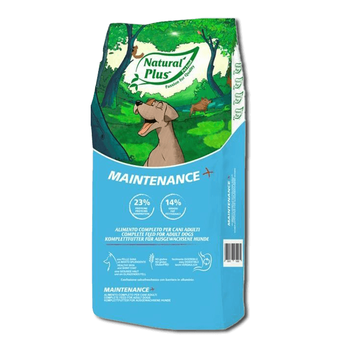 Natural Plus Maintenance Plus is een koudgeperste, professionele volledige voeding voor volwassen honden van alle rassen met een lage tot normale activiteit, uit onze speciaal voor fokkers en jagers ontwikkelde Natural Plus-lijn.