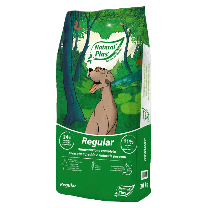 Natural Plus Regular is een natuurlijk, professioneel koudgeperst hondenvoer met rund, kip en varken. Geschikt voor normaal actieve honden van alle rassen en ideaal voor honden met een gevoelige spijsvertering of voedselintoleranties.