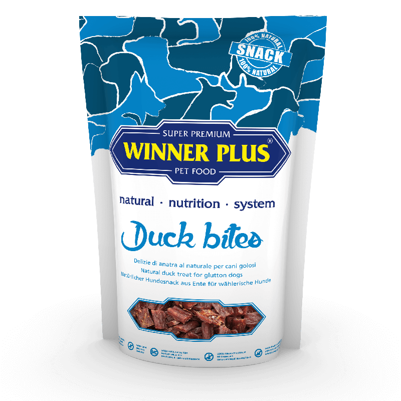 Natuurlijke eendensnacks voor honden die van lekker eten houden: natuurlijke en uitgebalanceerde aanvullende voeding voor honden, rijk aan eiwitten en vetten, bereid met uitsluitend zorgvuldig geselecteerd eendenvlees.