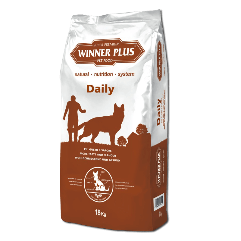 WINNER PLUS Daily is een super premium complete hondenvoeding voor volwassen honden met een normaal activiteitenniveau. Deze uitgebalanceerde dagelijkse voeding is geschikt voor alle rassen en ideaal tijdens de onderhoudsfase. Hoogwaardige dierlijke eiwitten, omega 3 & 6 en natuurlijke vitamine E ondersteunen verteerbaarheid, huid, vacht en vitaliteit.