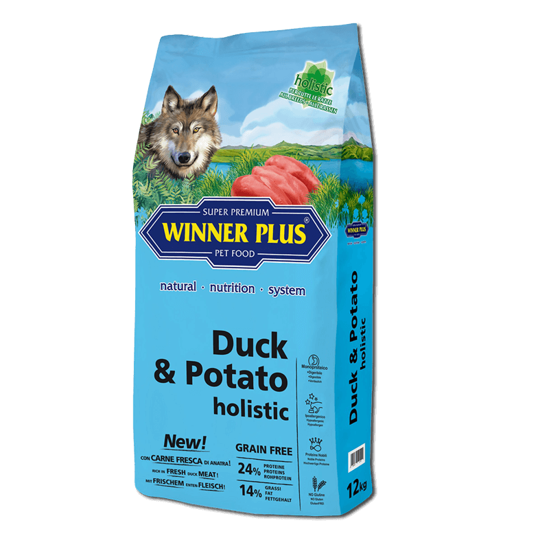 WINNER PLUS HOLISTIC EEND & AARDAPPEL is een zeer hoogwaardige monoproteïne complete voeding met vers eendenvlees, die tegemoetkomt aan de speciale voedingsbehoeften van gevoelige honden van alle rassen.
